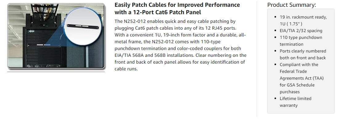 Constructed of top-quality materials and a durable, all-metal frame, the N052-012 is built to last. It also exceeds EIA/TIA TSB-40 standards for connecting Cat5e hardware, ensuring compliance with future services and industry standards.