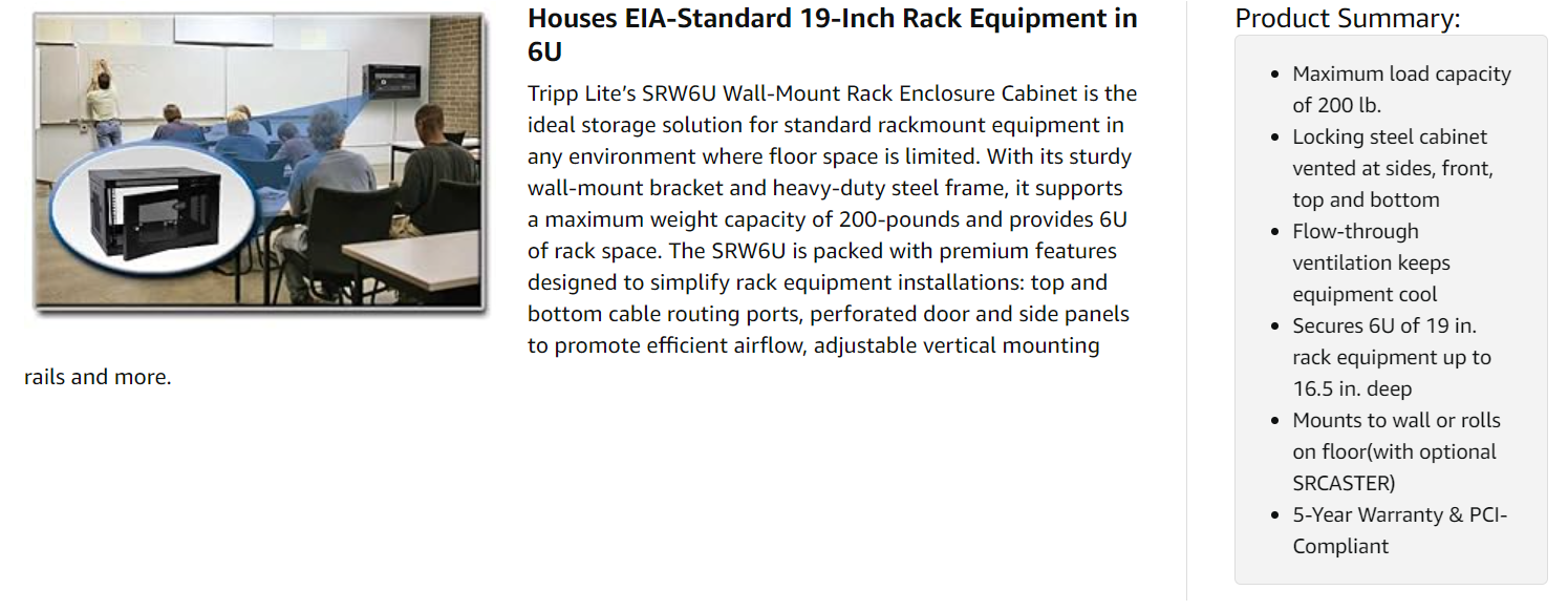 The SRW6U comes with a 5-year product warranty. It’s manufactured in compliance with strict RoHS specifications, reflecting Tripp Lite’s commitment to environmental responsibility. The SRW6U provides physical equipment and media security required for PCI DSS (Payment Card Industry Data Security Standard) compliance.