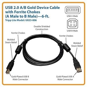 The molded U023-006 features ferrite chokes on both ends that provide protection from dangerous electromagnetic interference (EMI) that can damage or even destroy your data. Premium foil and braid shielding with twisted 28 AWG data lines and 24 AWG power lines deliver top-of-the-line signal quality. Gold-plated USB connectors with gold-plated copper contacts ensure excellent conductivity. Integral strain relief ensures the cable and connectors last a long time.
