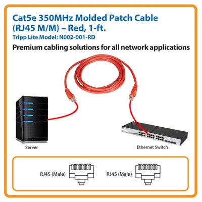 Manufactured from 4-pair stranded UTP, the N002-001-RD provides high-speed connection and flawless signal delivery. This cable can deliver speeds up to 350MHz/1 Gbps. Featuring a PVC jacket, this one-foot Tripp Lite Cat5e 350MHz Molded Patch Cable is constructed of top-quality materials for long life and durability. Its RJ45 (male) connectors are gold-plated for accurate signal transfer, and its molded integral strain-reliefs provide a secure connection. The N002-001-RD meets the most current industry standards, including IEEE 802.3ab, IEEE 802.5, ANSI/EIA/TIA 568, ISO/IEC 11801 and ETL (category 5e draft 11).