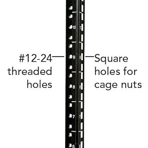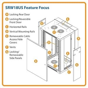 The SRW18US is compatible with all standard 19-inch rack equipment and is designed to simplify equipment installation. It features front and rear pairs of vertical mounting rails that are adjustable in quarter-inch increments to accommodate equipment depths from 3 to 20.5 inches. Adjustment is quick and convenient—simply unscrew the rails, slide them to the desired depth and restore the screws. The rails feature square mounting holes and each rack space within the enclosure is numbered for easy reference.