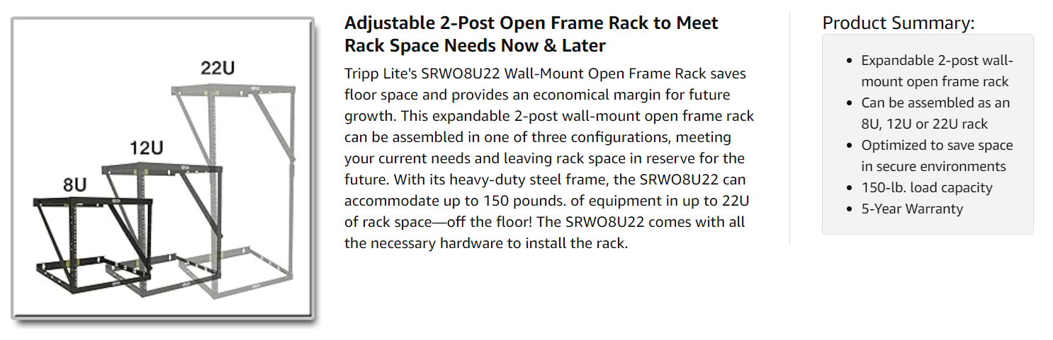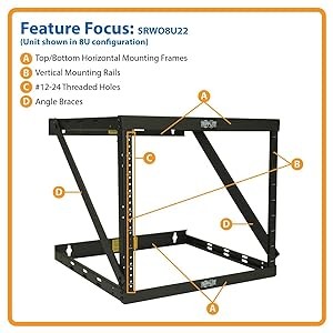 The SRWO8U22’s open frame design facilitates quick installation of equipment and provides convenient service access to equipment and cabling. The SRWO8U22 accommodates EIA-standard 19 inch esrackmount equipment and has a maximum mounting depth of 18 inches.