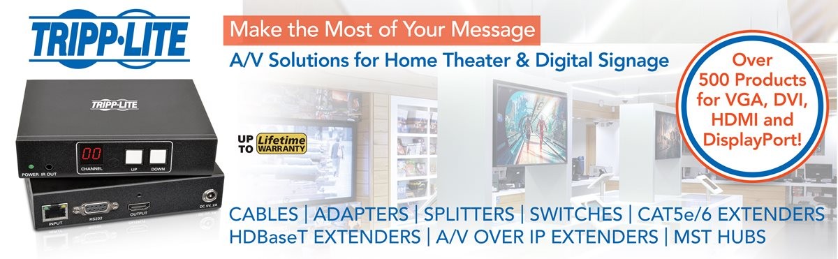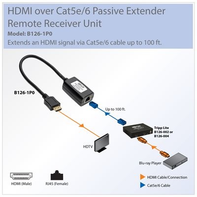 The B126-1P0 HDMI over Cat5e/6 Passive Extender Remote Receiver Unit works in tandem with Tripp Lite’s B126-002 or B126-004 transmitter units (sold separately) to extend an HDMI signal to a high-definition television, monitor or projector. It’s ideal for digital signage applications in schools, churches, trade shows, convention centers, retail environments and other locations where the video source is located farther from the display than conventional HDMI cables allow.