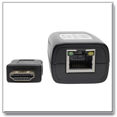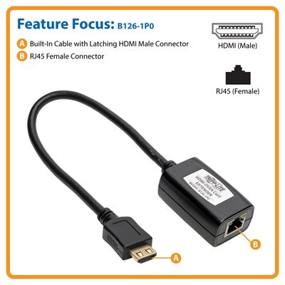 The plug-and-play B126-1P0 requires no external power, software or drivers. Just connect the built-in HDMI cable to the display and a Cat5e/6 cable between the RJ45 input jack and the transmitter for instant picture and sound. LEDs light up to indicate when the unit is receiving power and sharing a signal. The receiver works with all operating systems and HDMI video sources.