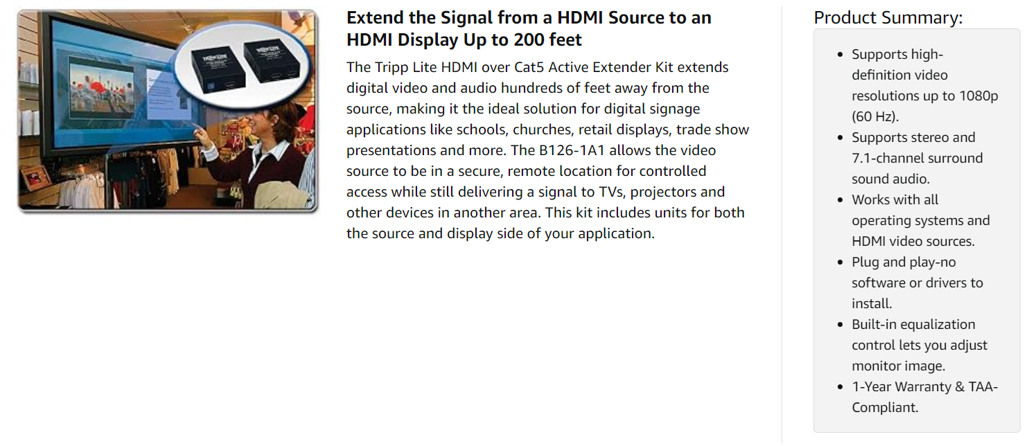 The B126-1A1 can extend a 1080p (24Hz) resolution up to 150 feet using 24 Awg Solid-Wire cabling like the Tripp Lite N202-series, allowing for maximum flexibility in any application. For maximum distance, the B126-1A1 can carry a 1080i (24Hz) resolution up to 200 ft. when using 24 Awg Solid-Wire cabling.