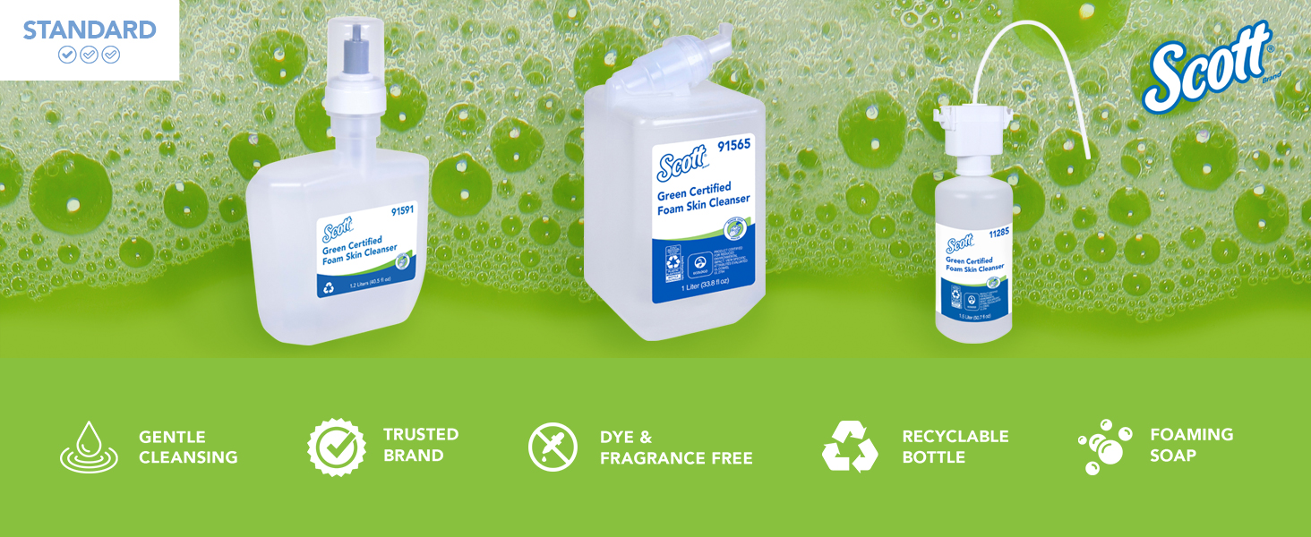 Scott® is one of the world’s most recognized restroom brands with over 150 years of experience keeping your staff and guests healthy. Show you care by providing Scott® Green Certified Skin Cleanser, which offers a reliable balance of efficiency, performance and value so that you're helping to stop the spread of germs with a trusted hand soap solution. This Scott® brand foaming hand soap also helps you show your commitment to being environmentally conscious, since it is fragrance-free, dye-free, ECOLOGO® certified, and comes in a recyclable bottle. Scott® hand soap keeps hands clean in schools, workplaces, stores, and more. Because the soap is NSF E-1 rated, it is also suitable for use in food processing and food service settings. When you're charged with maintaining washrooms in busy environments, Scott® soap dispenser refills maximize your productivity, while ensuring staff and guests at your facility stay clean and healthy.