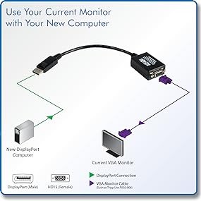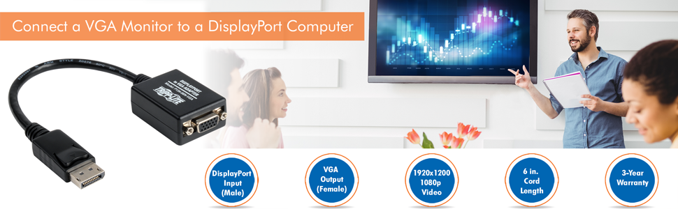 This cable adapter helps you save money by using your current VGA monitor with a DisplayPort-equipped computer. Active digital-to-analog circuitry, premium double shielding and quality manufacturing ensure a clean, consistent video signal.