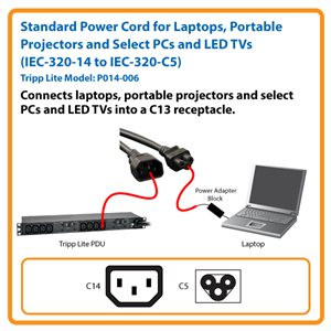 • Extends power connections an additional 6 ft. when used with an existing power cableTripp Lite's P014-006 cable contains a C14 male connector on one end and a C5 female connector on the other. With the P014-006, you can use it as an extension to increase the functionality of an existing cable, or as a single power cord that’s just the right length to connect to the C13 port on your UPS or PDU. Simply connect the C5 end into a compatible AC power adapter block or internal power supply and insert the C14 end into an existing server power cord or direct AC source.