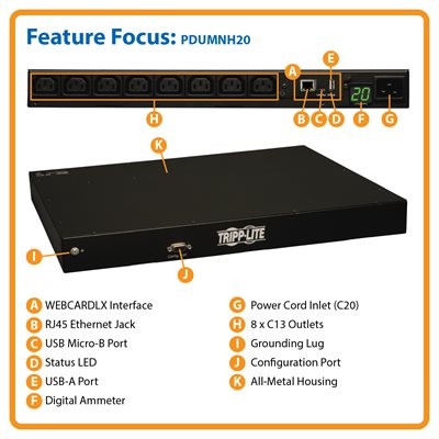 With a built-in Java-free, HTML5-based LX Platform interface (the mobile-friendly PowerAlert ® Device Manager), the PDUMNH20HV provides complete remote access for power monitoring and email notifications via a secure network or Web browser. When used with an optional EnviroSense2 environmental sensor (sold separately), it can also perform temperature/humidity and dry contact monitoring, providing IT personnel with enhanced oversight of facility power and environmental conditions. As an added bonus, up to three EnviroSense2 modules can be daisy-chained together. The PDUMNH20HV supports 10/100 Mbps auto-sensing for optimum communication with an Ethernet network. Automated alerts can be configured to warn against potential overload, power loss and downtime. Protocols supported include IPv4, IPv6, HTTP, HTTPS, SMTP, SNMPv1, SNMPv2, SNMPv3, telnet, SSH, FTP, DHCP and NTP. DHCP/Manual configuration support provides the ability to have network settings automatically assigned or manually assigned via a permanent IP address.