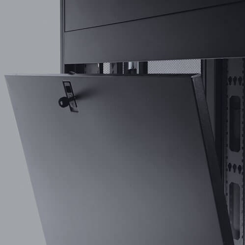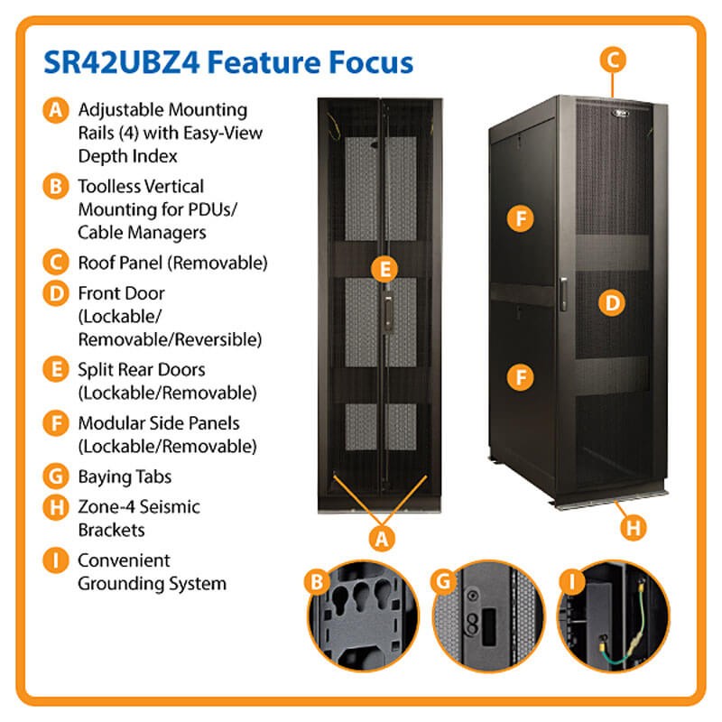 The SR42UBZ4 is designed to provide a safe, secure installation solution for mission-critical rackmount equipment. Its locking, reversible front and rear doors are perforated to promote efficient airflow, and locking, removable side panels. Locking doors and side panels prevent unauthorized access to installed equipment. The side panels are half size (two per side) for ease of removal and reinstallation. The front door is reversible and the split rear door design reduces clearance requirements for service access so the enclosure cabinet can be placed closer to a wall.