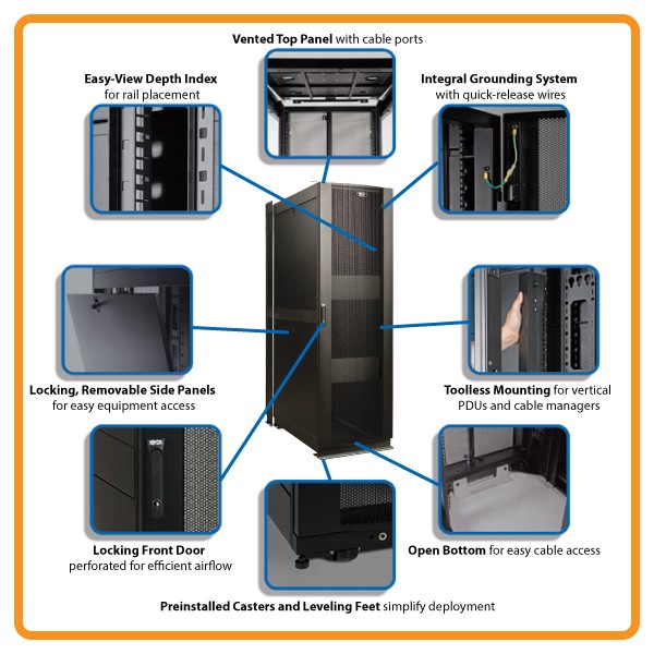 The SR42UBZ4’s massive front-to-rear ventilation capacity meets or exceeds server manufacturer requirements. It also offers full compatibility with a wide range of airflow optimization accessories and cable management accessories. Its integrated baying tabs make it easy to combine multiple enclosure cabinets in rows for data center applications. The SR42UBZ4 offers guaranteed compatibility with all EIA-310-E compliant 19-in. equipment, and is also 100% compatible with today's state-of-the-art hot-aisle/cold-aisle data center configurations.