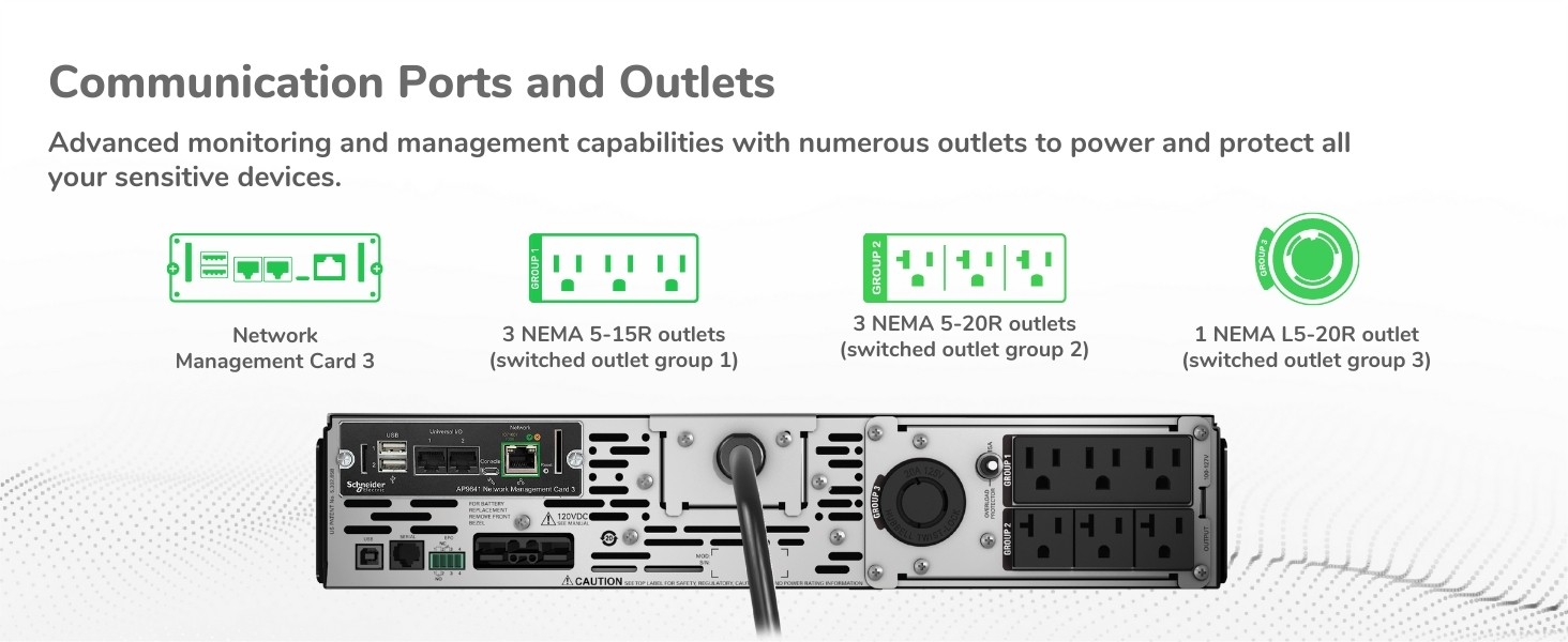 Pre-installed network management card Enables network-based monitoring and management of UPS. |