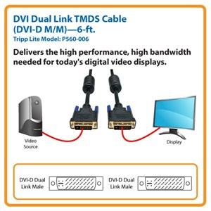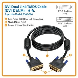 This genuine Tripp Lite DVI Dual Link TMDS Cable offers an easy, inexpensive solution for connecting a standard DVI monitor, flat-panel display or digital CRT projector to your computer over distances of up to 6 feet. Featuring two DVI-D male connectors, the P560-006 assures peak performance with no loss of signal quality.