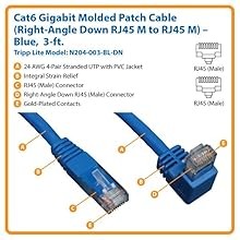 Don’t settle for less than the best—enjoy better signal quality and faster transmission! This three-foot Tripp Lite Cat6 Gigabit Molded Patch Cable ensures ultra-fast performance throughout your local area network application. Cat6 cables (also called network cables, patch cables, computer cables, Ethernet cables and LAN cables) are used to connect components like printers, computers, copy machines, routers, servers, modems, switches and Cat6 audio/video products. One end of this cable has a right-angle down design that makes connections easier in tight corners and reduces cable strain.