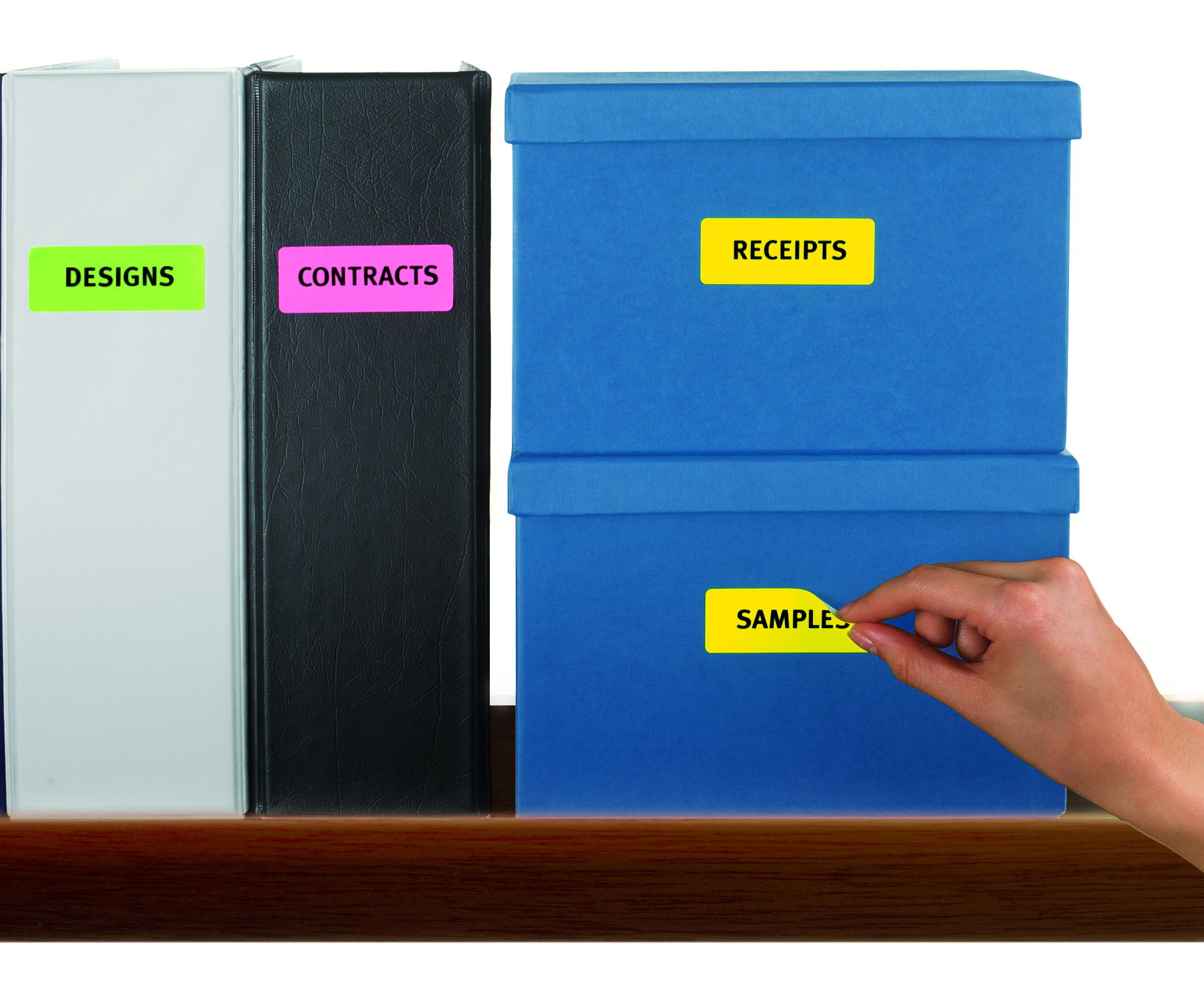 Use bright colored labels for eye-catching home organization. These removable labels are great for labeling bins, boxes, binders and more!