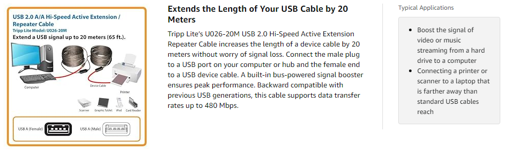 The U026-20M works with all computers, devices and cables with USB-A connectors, and provides up to 250mA of power to a connected device (an external power supply or powered USB 2.0 hub is required for applications stronger than 250mA). Premium foil-and-braid shielding delivers top-of-the-line signal quality and protection from EMI/RFI interference. Nickel-plated USB connectors with gold-plated copper contacts ensure excellent conductivity. Integral strain relief guarantees long life and durability.