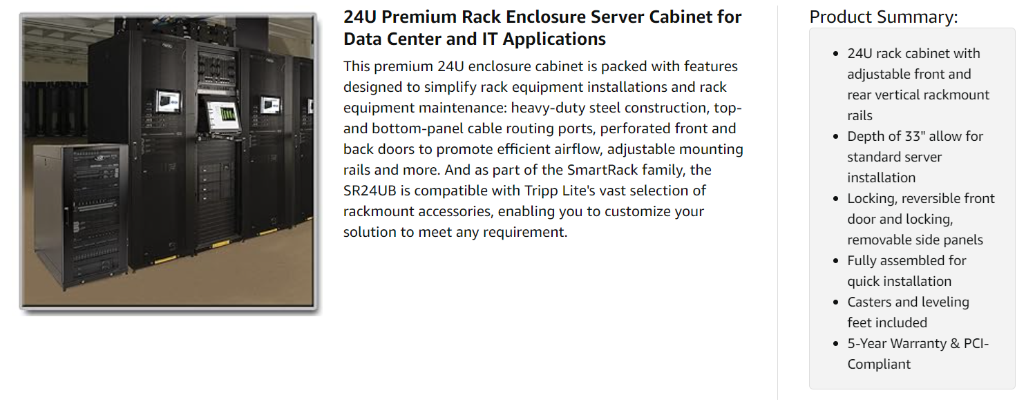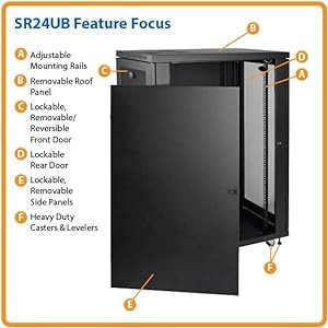 The SR24UB is designed to provide a safe, secure installation solution for mission-critical rackmount equipment. It contains a locking, reversible, removable front door that is perforated to promote efficient airflow, as well as locking, removable solid side panels. Locking doors and side panels prevent unauthorized access to installed equipment.