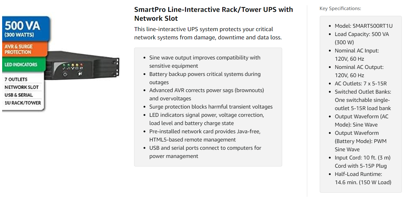 Half-Load Runtime: This UPS system will support a 50% load (150 W) for up to 14.6 minutes.