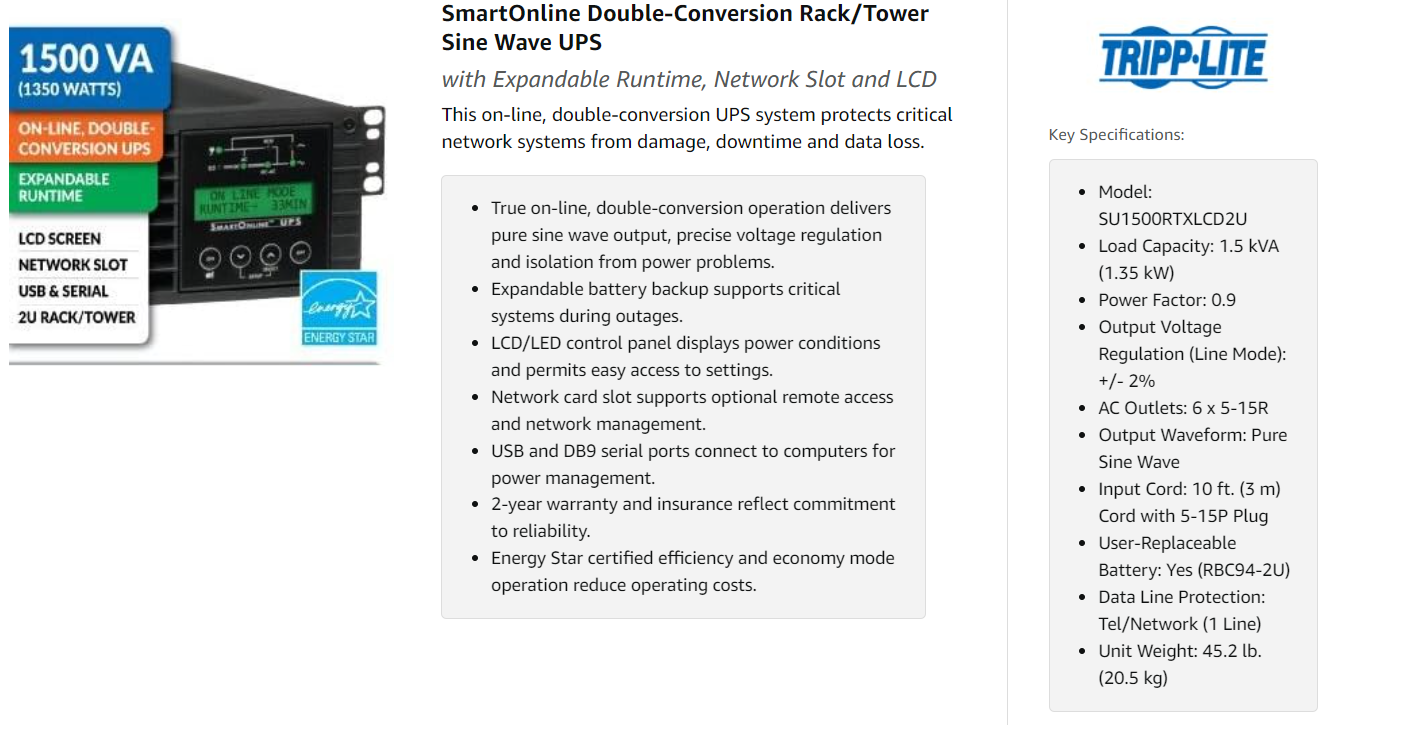 - Half-Load Runtime: This UPS system will support a 50% load (675W) for up to 14 minutes using the included batteries.