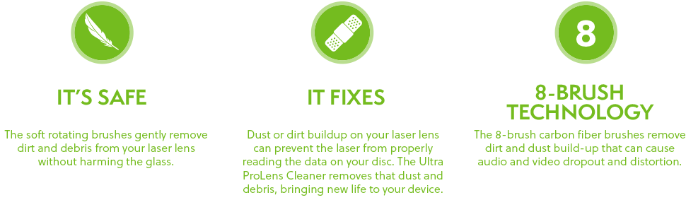 The Ultra Pro Lens Cleaner uses carbon fiber technology to dissipate static and eight staggered brushes that progressively pass over the laser lens to clean the entire surface. The cleaning process takes only a fraction of a second and can actually prolong the life of your disc player.