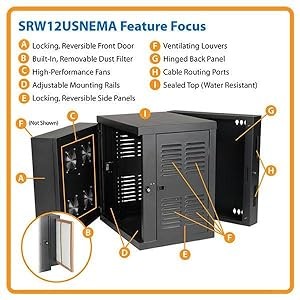 An included wall bracket with a sturdy hinge allows the SRW12USNEMA to swing away from the wall for convenient access to equipment and cabling. A locking, reversible front door and locking, removable side panels prevent unauthorized access while allowing authorized personnel to easily perform inspections and maintenance.