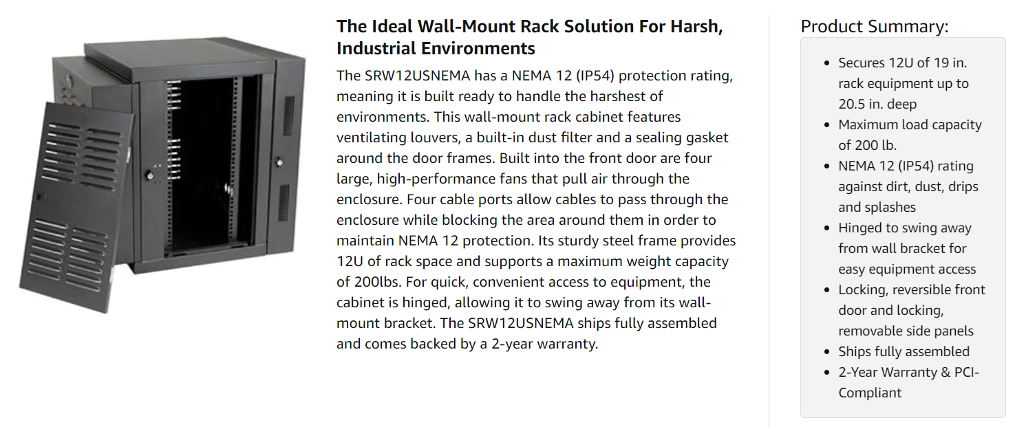 The SRW12USNEMA is manufactured in compliance with strict RoHS specifications, reflecting Tripp Lite’s commitment to environmental responsibility. For peace of mind, it comes backed by a 2-year warranty. The SRW12USNEMA also meets all enclosure requirements towards PCI DSS (Payment Card Industry Data Security Standard) compliance.