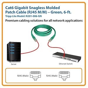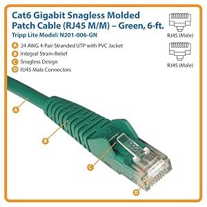 For peace of mind, this six-foot Tripp Lite Cat6 Gigabit Snagless Molded Patch Cable comes backed by a lifetime warranty. The N201-006-GN is manufactured in compliance with strict RoHS specifications, reflecting Tripp Lite’s commitment to environmental responsibility.