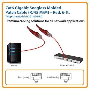 For peace of mind, this six-foot Tripp Lite Cat6 Gigabit Snagless Molded Patch Cable comes backed by a lifetime warranty. The N201-006-RD is manufactured in compliance with strict RoHS specifications, reflecting Tripp Lite’s commitment to environmental responsibility.