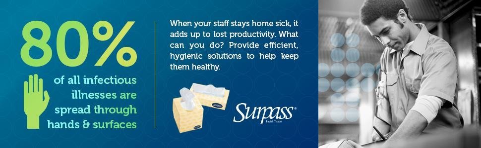 Offering Surpass Facial Tissue (flat box) can be a key step to helping your employees, patients and guests stay healthy. These strong, absorbent tissues are soft and practical.