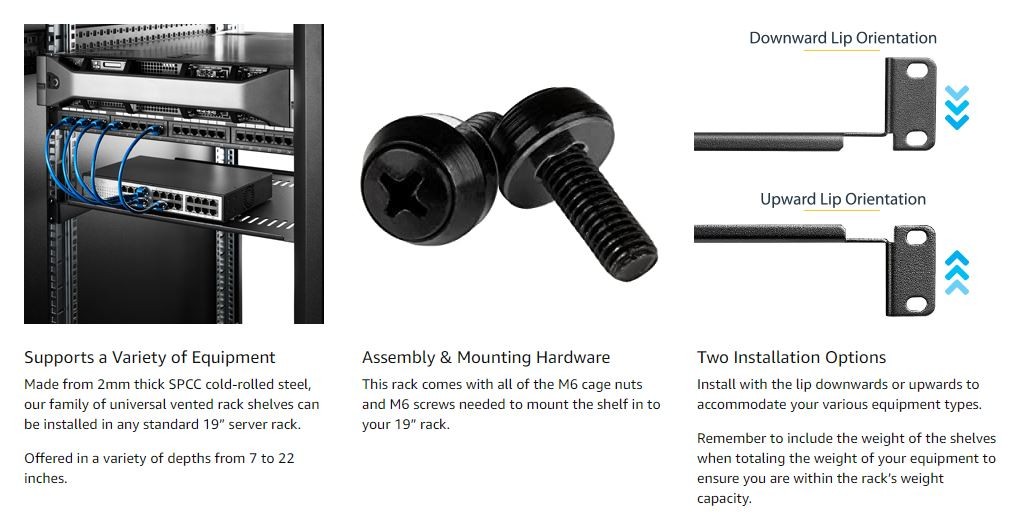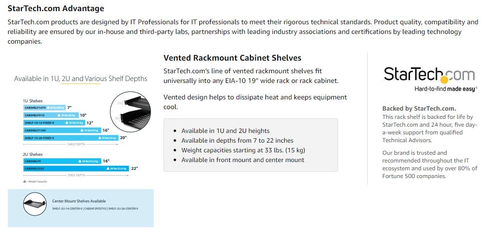 StarTech.com 2U Server Rack Shelf - Universal Vented Rack Mount Cantilever Tray for 19" Network Equipment Rack & Cabinet