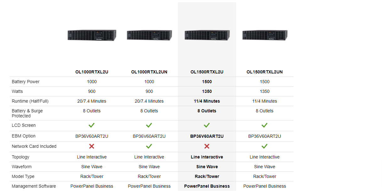 The optional BP36V60ART2U extended battery module can help extend runtimes. This UPS allows for up to ten added EBMs.