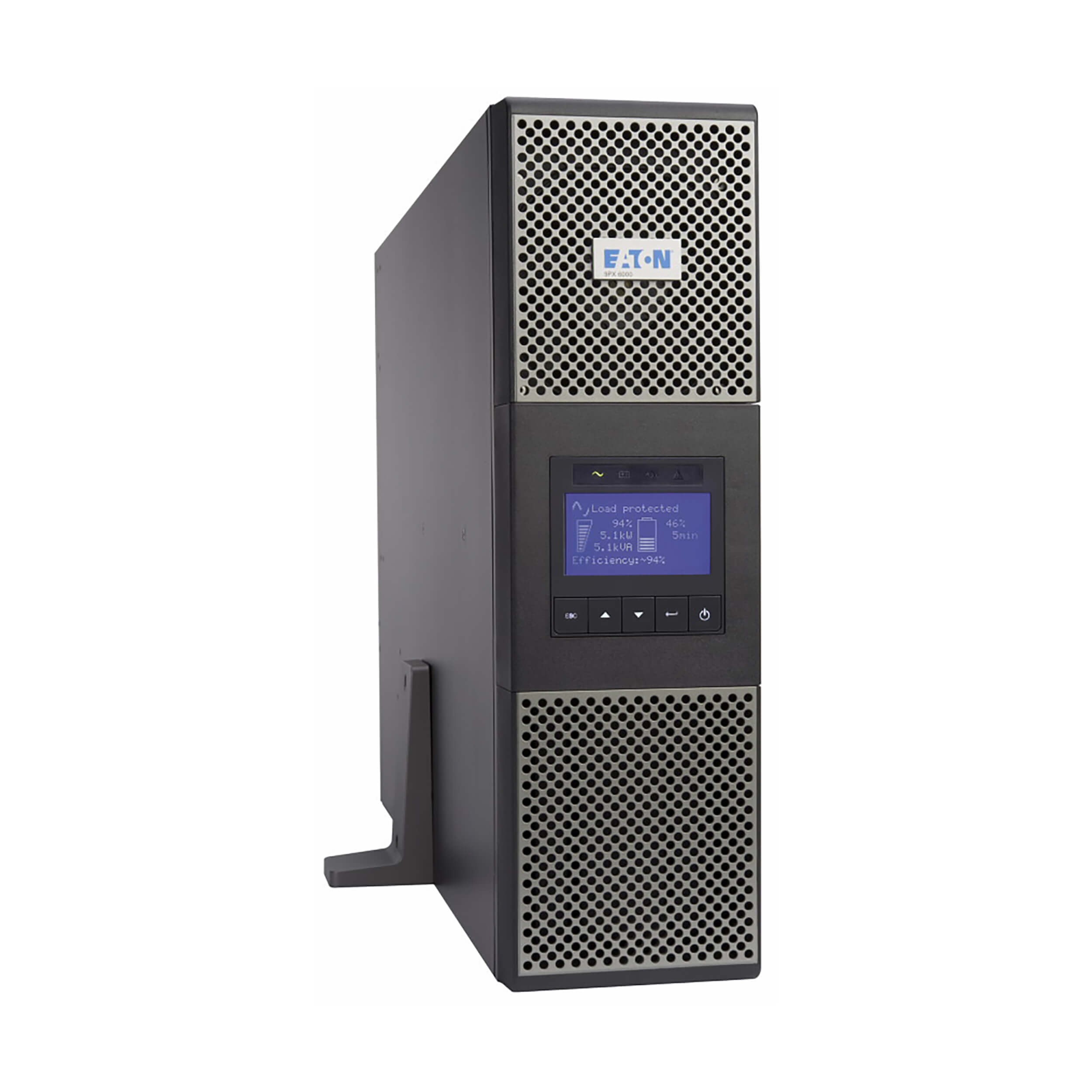 You can mount the 9PX6K in just 3U of space in an EIA-standard 19-inch rack using the included 4-post rail kit or an optional 2-post rail kit (RK2PC, sold separately). You can also adapt it for tower installation using the included support stands. The six-foot power cord with NEMA L6-30P plug connects to a compatible AC outlet. A cable gland is included for alternate hardwire input.