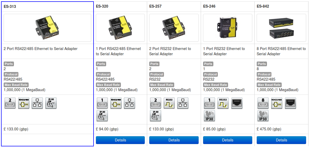 Ethernet to Serial device server providing access to two RS422/485 serial ports. Data transfer rates up to 1,000,000 baud, coupled with 1Mbit/s line drivers deliver uncompromising performance. Our ES range provides simple instant networked serial ports. RS485 - 1 twisted pair - half duplex configuration with autogating provides trouble free data transmission due to automatic control of data direction. A web interface allows secure configuration and control of the serial ports over a local network or the internet using any browser. For Windows our in-house designed (32 bit and 64 bit) driver gives you local COM ports, retaining existing software applications and allowing you to connect across your network to remote devices just as if they were attached locally. Serial Port Tunnelling (individually configurable) allows serial cable replacement over any distance, no software required. You can access the device via TCP/IP sockets from any networked device like an Android tablet, PC or phone. On Windows OS TCP/IP sockets are handled by the Winsock API, this will differ on other OSs.