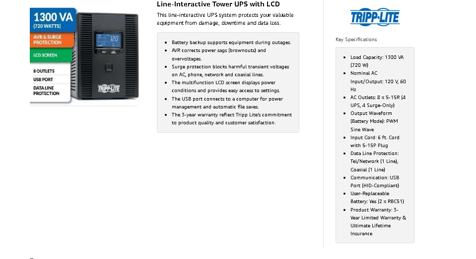 - Single-Computer Runtime: This UPS system will support an energy-efficient desktop computer and LCD monitor (75 W load) for up to 64 minutes during an outage.