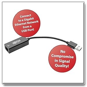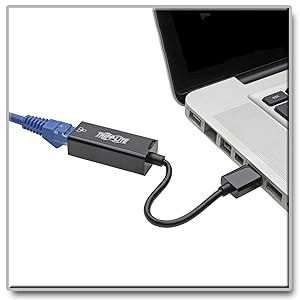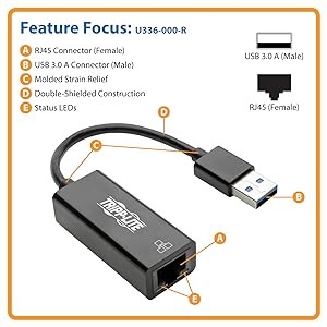 Finally – a simple network connection! Tripp Lite’s U336-000-R USB 3.0 to Gigabit Ethernet Adapter instantly connects a computer, laptop, notebook or Chromebook to a Gigabit network through a USB port without requiring the installation of an internal Ethernet card. This compact, USB-powered adapter offers plug-and-play convenience with no external power supply needed. It supports true 10/100/1000 Mbps Ethernet speeds for ultra-fast downloads, and USB 3.0 compatibility allows large data transfers without compromising signal quality. This adapter is the perfect companion for traveling presenters, lecturers, salespeople and anyone needing to connect to a wired network on-the-go. Use it in auditoriums, libraries, hotel lobbies, trade show booths or anywhere a wired connection is available.