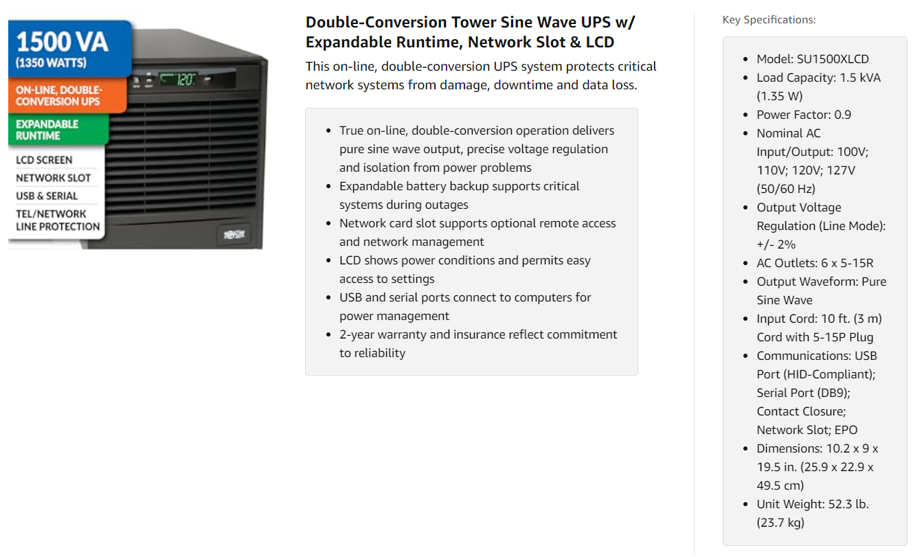 - Half-Load Runtime: This UPS system will support a 50% load (675W) for up to 14 minutes using the included batteries.
