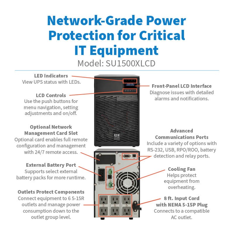 The convenient LCD status screen provides easy access to detailed UPS settings and information. The illuminated LCD displays a variety of helpful data, including voltage, frequency, load percentage, load wattage, power status, battery status, operating mode, battery capacity and estimated backup runtime remaining. The intutive controls also allow you to change the UPS system's operating mode and other settings. The LCD provides more information and greater control than comparable models, allowing you to diagnose and respond to power problems before they cause downtime.