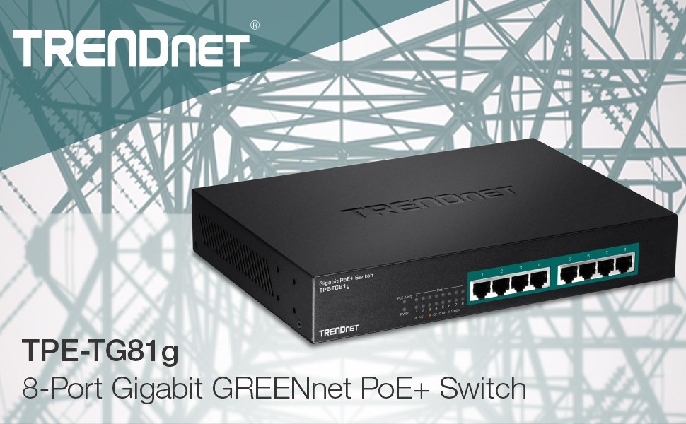 TRENDnet's 8-Port Gigabit GREENnet PoE+ Switch, model TPE-TG81g, reduces equipment and installation costs by delivering data and power over existing Ethernet cables. This unmanaged switch offers eight Gigabit PoE+ ports which supply up to 30W of power per port for devices such as high power wireless access points, IP Cameras, and VoIP telephony systems. It supports both PoE (802.3af) and PoE+ (802.3at) devices with a 110W PoE budget. This rack mountable switch features a fanless design that eliminates operating noise and lowers energy consumption.