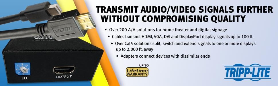By daisy-chaining up to six units, one audio/video source can transmit to as many as 49 displays—48 remote and one local. Add up to three B132-110A remote repeaters (sold separately) to each channel to fully extend the signal range or add more displays. You can extend a 1920 x 1440 (60 Hz) signal up to 500 feet or a 1024 x 768 (60 Hz) signal up to 1,000 feet from the first repeater in the chain to the last receiver.