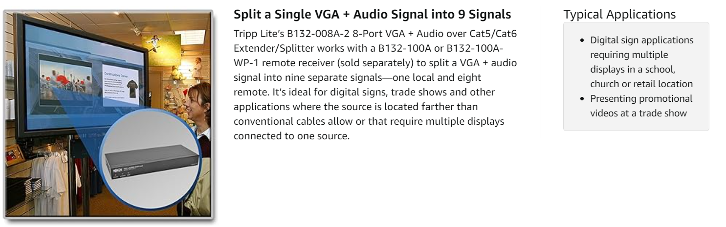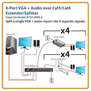 When used with Tripp Lite’s B132-Series active remote receivers, the B132-008A-2 can extend a 1920 x 1440 (60 Hz) signal up to 500 feet and a 1024 x 768 (60 Hz) signal up to 1,000 feet. The unit uses VGA cable to connect to the source and displays and Cat5e/6 cable to transmit to the remote receivers.