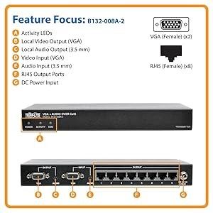 The B132-008A-2 also delivers high-quality audio and copies EDID information from a connected display to ensure optimal compatibility. It’s a breeze to set up with no software or drivers to install, and mounts to a wall, rack or pole using the included hardware. Convenient LEDs indicate at a glance when the unit is receiving power and a VGA signal from the source.