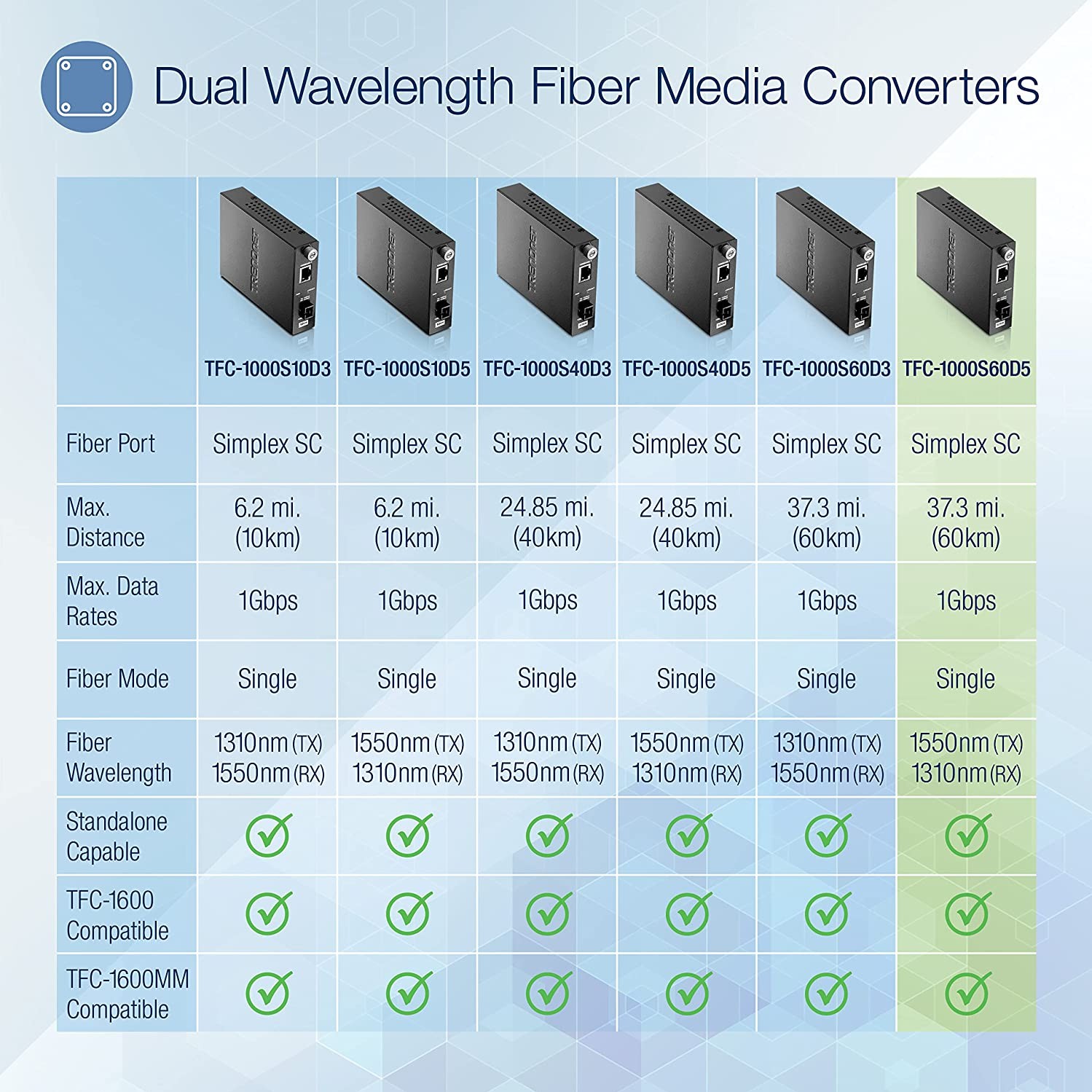 The TFC-1000S60D5 Bi-Directional Intelligent Fiber Converter works with the TFC-1600 chassis system or as a standalone unit. This converter is a Dual Wavelength Single Mode SC-Type fiber converter that supports port-based SNMP reporting and spans distances up to 60 km (37.3 miles). This module must be used with the TFC-1000S10D3 module. Ports include 1 x 1000Base-T (RJ-45) port and 1 x 1000Base-LX (SC Simplex Type) port.
