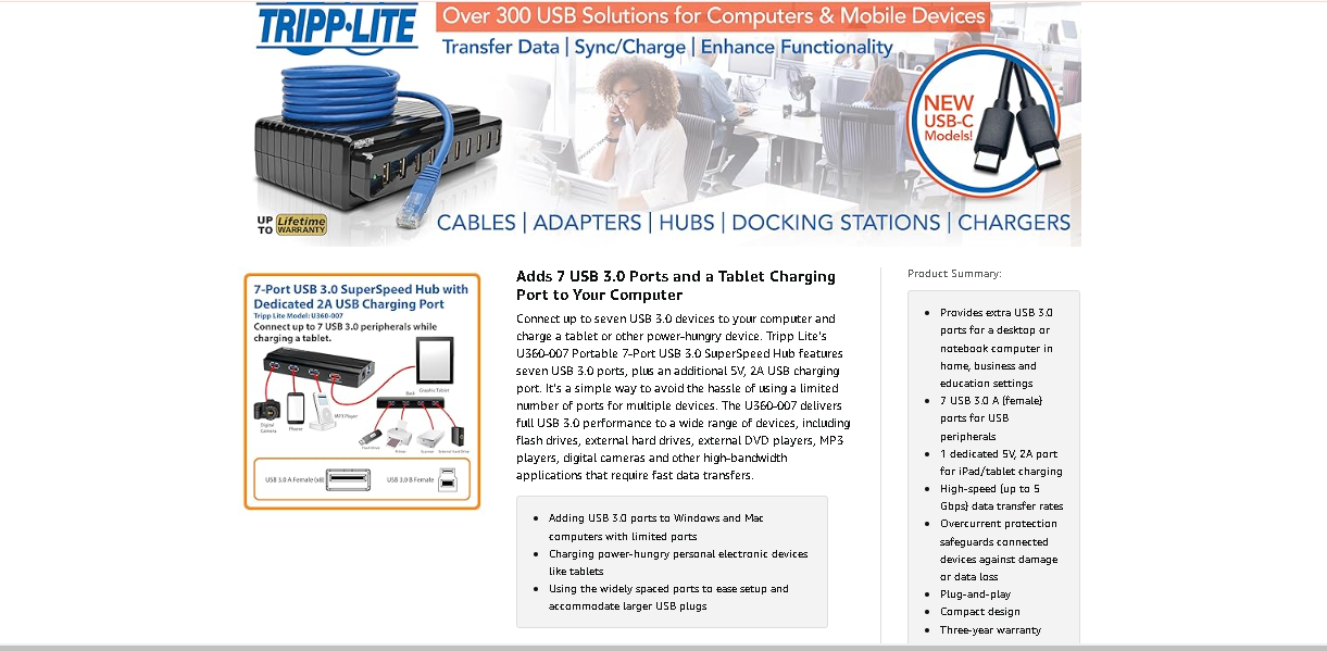 The U360-007 comes with a three-year warranty. It’s manufactured in compliance with strict RoHS specifications, reflecting Tripp Lite’s commitment to environmental responsibility.