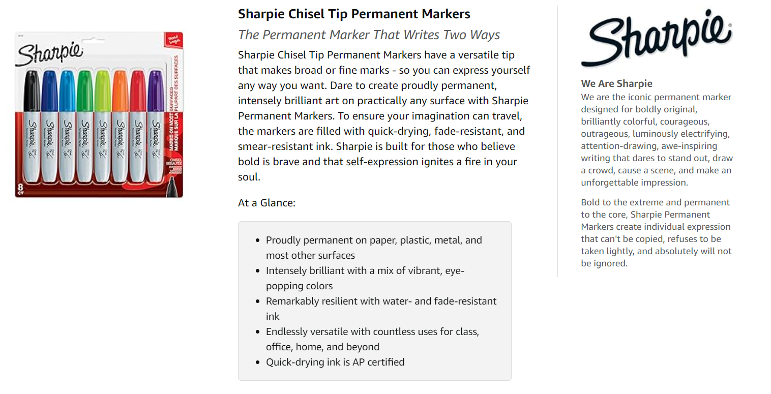 Made to mark and stand out on almost every surface, iconic Sharpie permanent ink is quick drying and water- and fade-resistant.