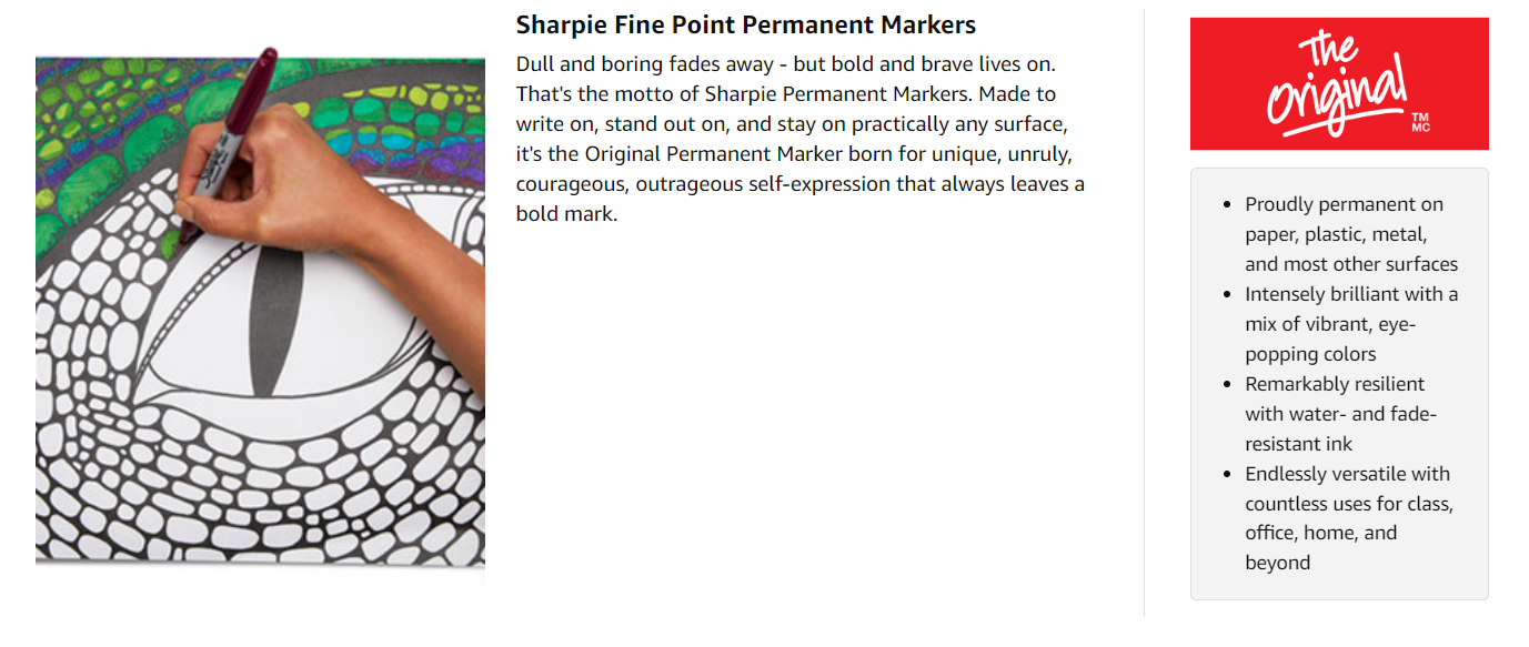 Proudly Permanent InkMade to mark and stand out on almost every surface, iconic Sharpie permanent ink is quick drying and water-and fade-resistant. |