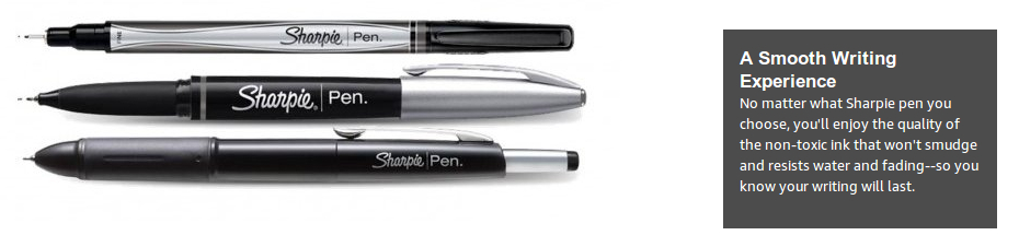 <b>  Sharpie Pen (Medium Point)      </b></br>   Never bleeds through paper and won't smear--the medium point tip is perfect for your bold, everyday writing needs.