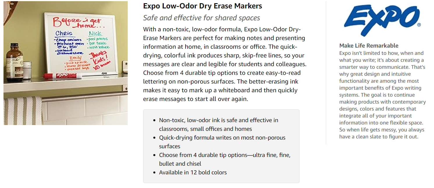 Expo Low-Odor Dry Erase MarkersExpo Low-Odor Dry-Erase Markers minimize unpleasant smells at home or in the classroom. The low-odor formula is safe for children, and the quick-drying ink ensures that your messages remain clear and easy to read. |
