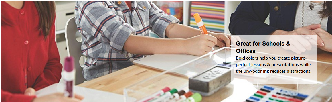 Track, Schedule & Present with Bold, Low Odor Markers Keep your classroom engaged, create compelling presentations and stay organized at home with Expo Low Odor Dry Erase Markers. The #1 dry erase marker brand, these whiteboard markers are available in a bold range of colors that produce consistent marks with less skipping. Use Expo dry erase markers to track, schedule and present your point in a brilliant fashion. Intense, bold colors take center stage even from a distance. You can get Expo wet or dry erase markers in a wide range of tip sizes, ensuring your point gets across. Erasing is also a breeze, wiping away cleanly with a cloth or Expo eraser from most non-porous surfaces.- Bold, easy-to-see color