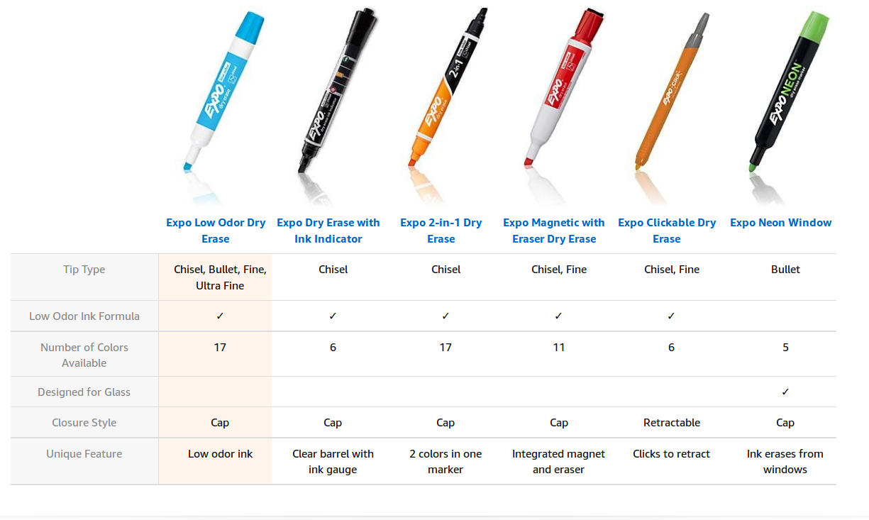 Trusted in Offices From important client meetings to brainstorming and strategic planning sessions, you can count on reliable Expo dry erase markers. The #1 dry erase marker brand, the white board markers create consistent, easy-to-read lines and erase cleanly from most non-porous surfaces.