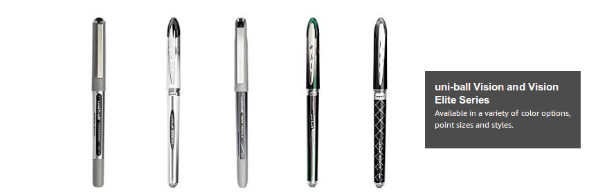 uni-ball Vision No matter which pen you select from the uni-ball Vision series, you’ll achieve an exceptionally smooth, flawless writing experience. These stick pens are available in eight ink colors, with a fine or micro point.